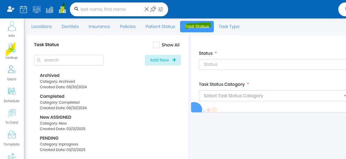 - Navigate to Practice Configuration -> Look Up -> Task Status