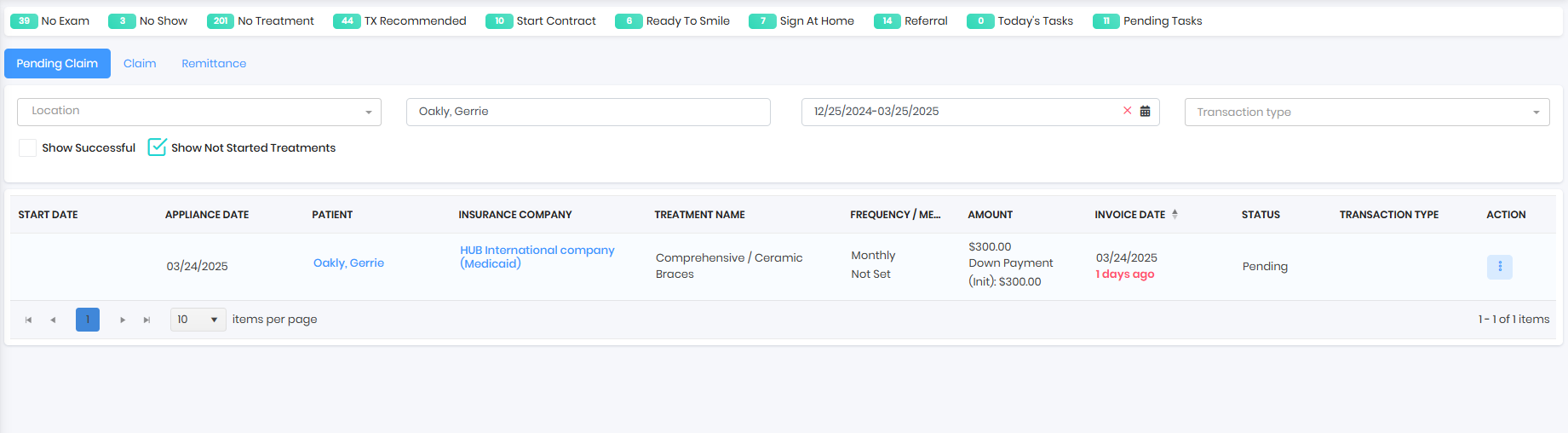With No start date claim will not show on the default pending claims view, we need to check Not Started Treatments