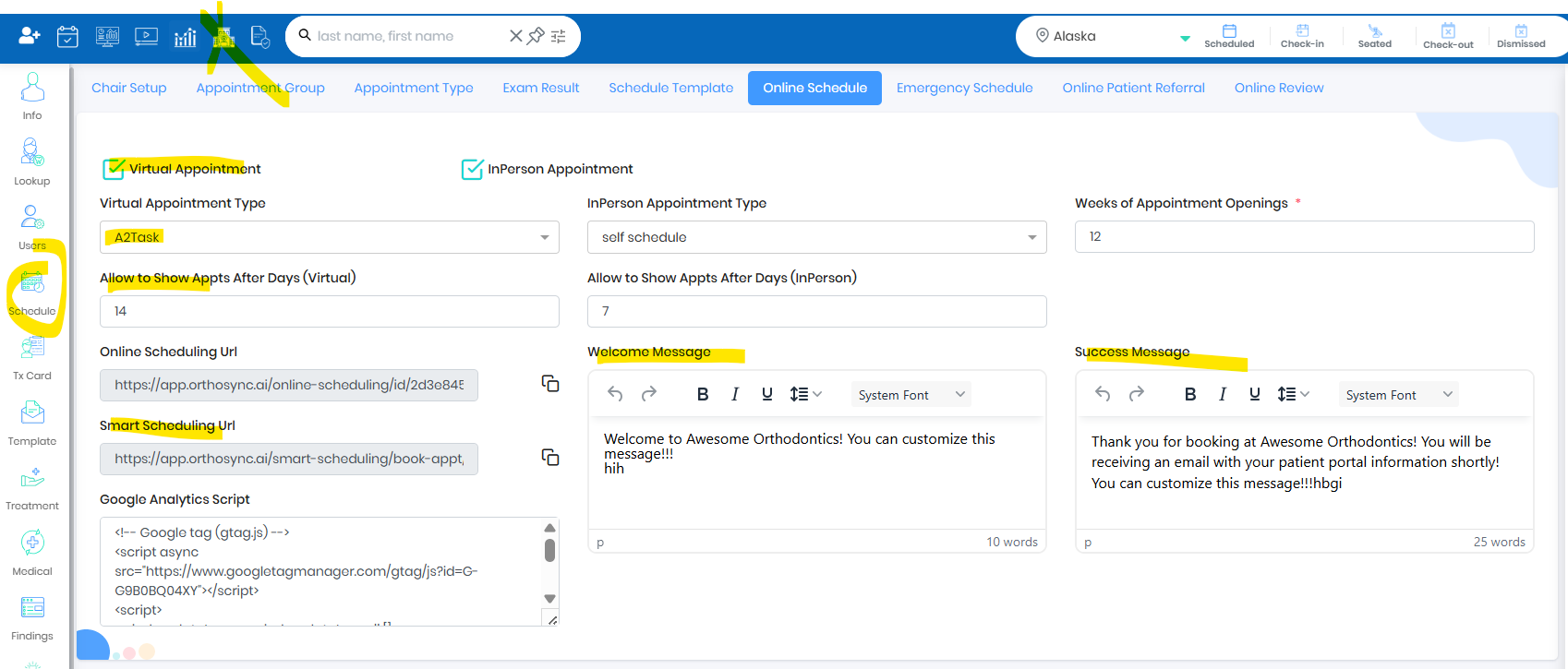 - Set up the welcome message shown when patients land on the page and the success message displayed after an appointment is booked