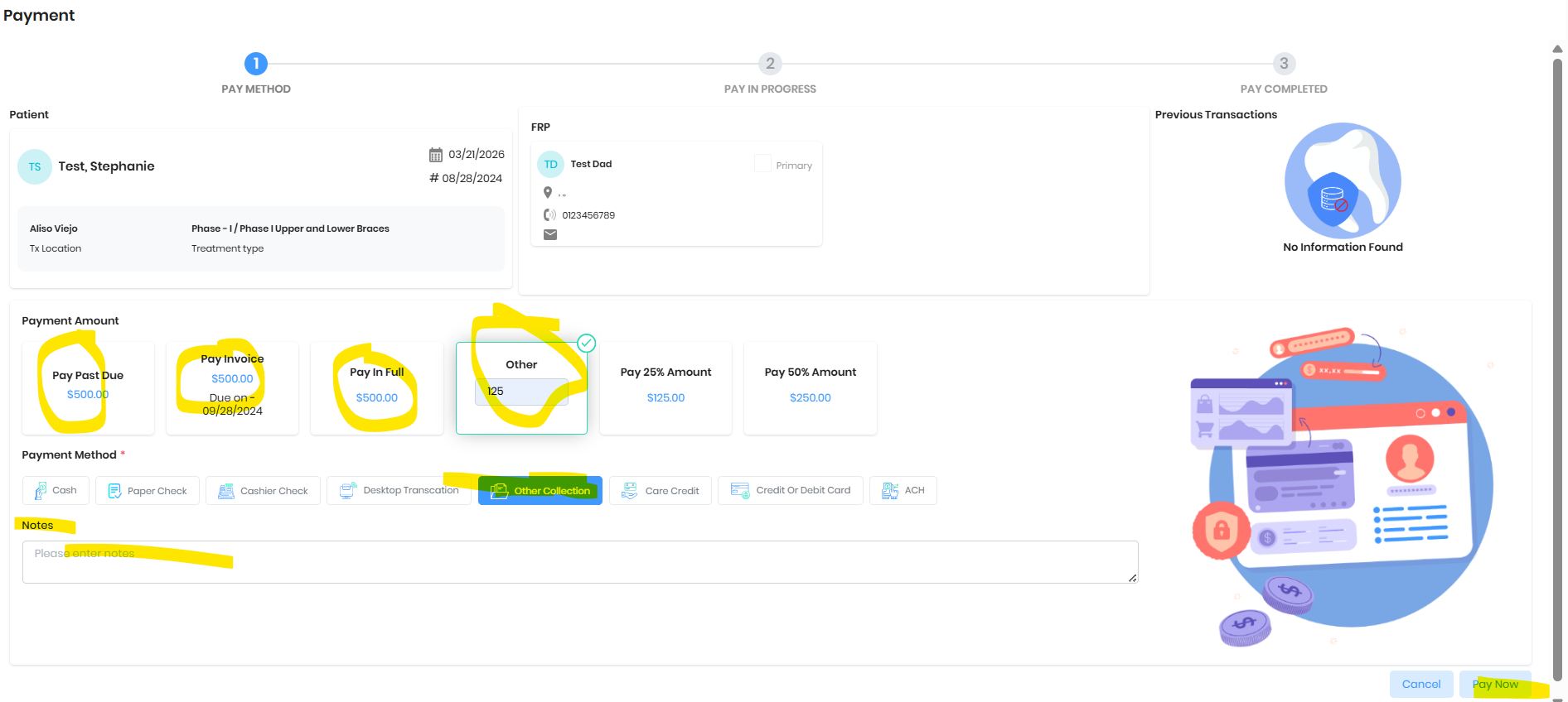 Select the respective Invoice to process, select Other Collection, add notes and Paynow